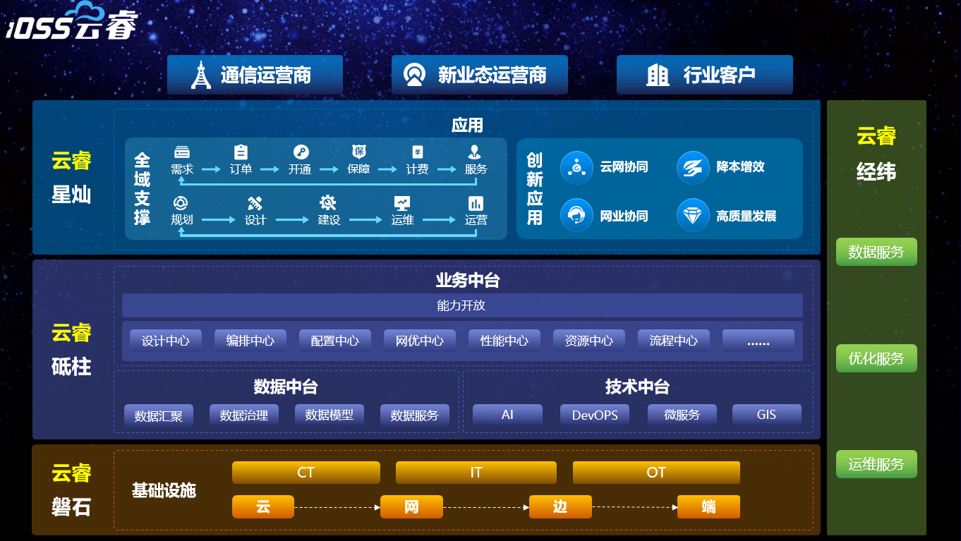 金数据iOSS云睿包括4大方向,涵盖通信运营商所需要的核心场景和能力:云睿磐石、云睿砥柱、云睿星灿、云睿经纬。